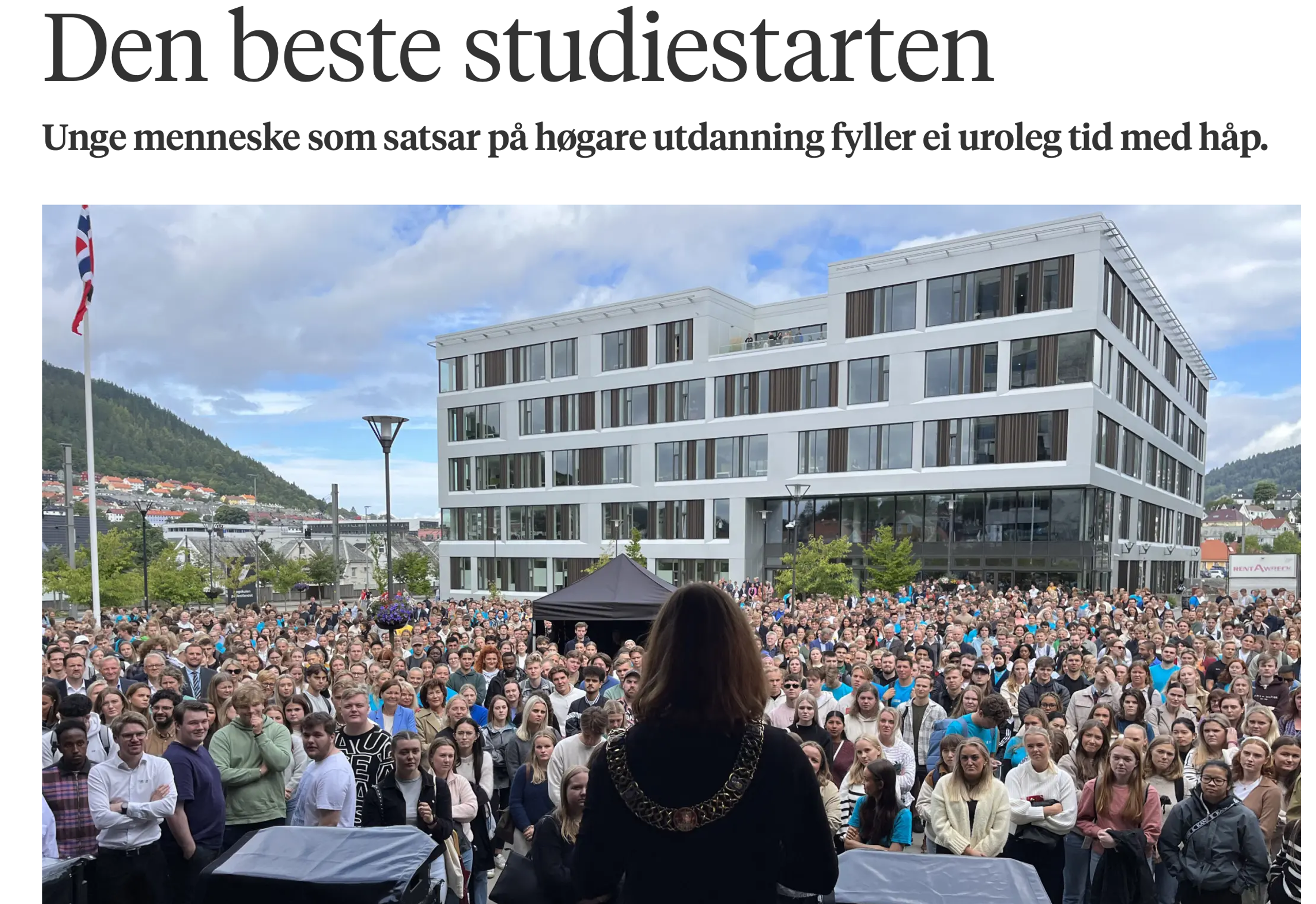 Studiestart ved campus Bergen i 2023. Skjermdump: Khrono.no Den beste studiestarten Unge menneske som satsar på høgare utdanning fyller ei uroleg tid med håp, skriv studenttingsleiar Mattis Munkvold Rovik og eg om i Khrono. Her finn du teksten