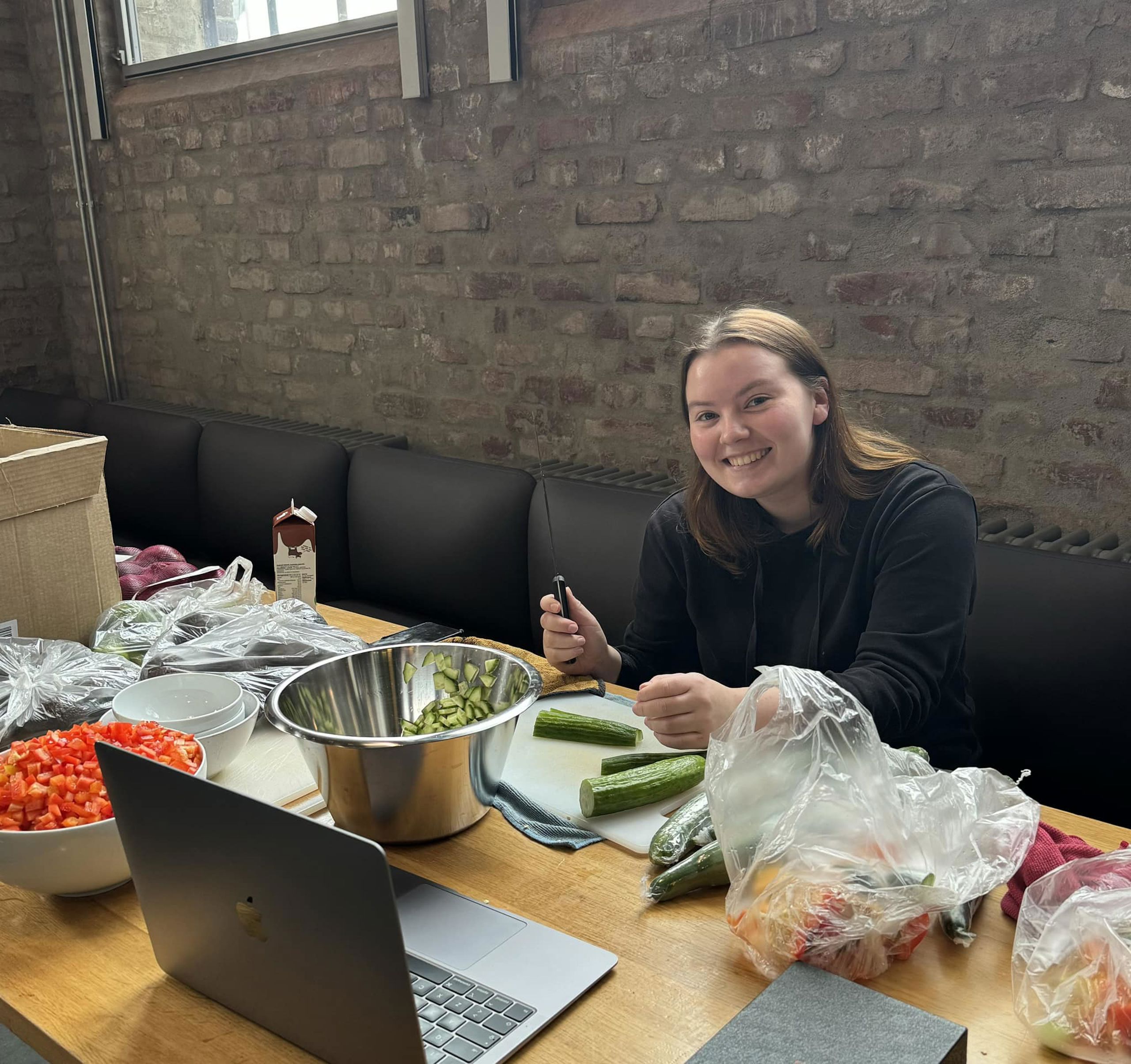 På ettermiddagen fredag 18. oktober møtte eg ho inne på Kronbar på Kronstad. Her dreiv ho og kutta opp grønsaker og førebudde fin laurdagskveld for studentar som arbeider frivillig.