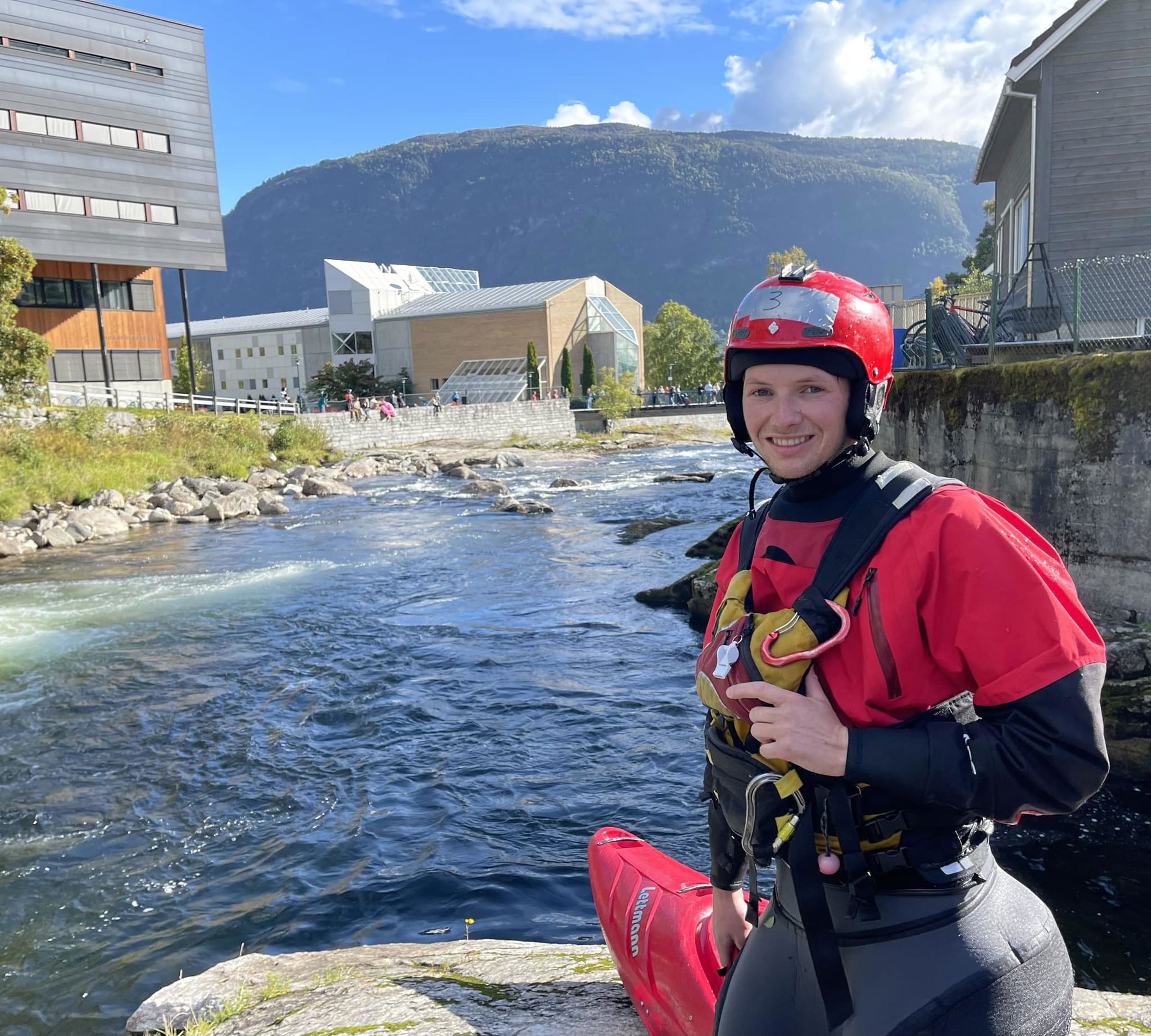 Siste laurdagen i september møtte eg han på elvekanten iført fullt redningsutstyr og line, idet han saman med andre studentar i Sjøspretten gjennomførte studentleikar i elvepadling for både røynde padlarar og nybyrjarar.
