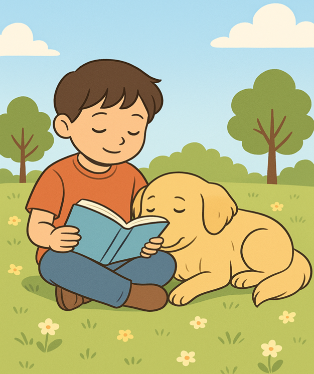 Figur 1: OpenAI. (2025). Barn som leser for en hund [AI-generert illustrasjon]. Generert med ChatGPT