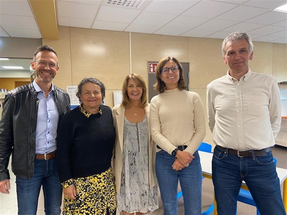 Fra venstre: Bjørn Håvard Bjørklund, kommunalsjef for oppvekst, kultur og idreett i Bømlo kommune, førstelektor Marit Kulild fra Høgskulen på Vestlandet, professor Ruth Leicht fra Queen’s University Belfast, Tone Baugstø, rektor ved Rubbestadneset skole og Geir Holme, inspektør ved Rubbestadneset skole.
