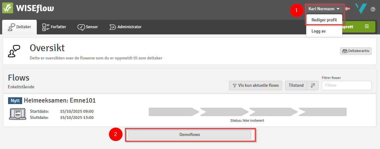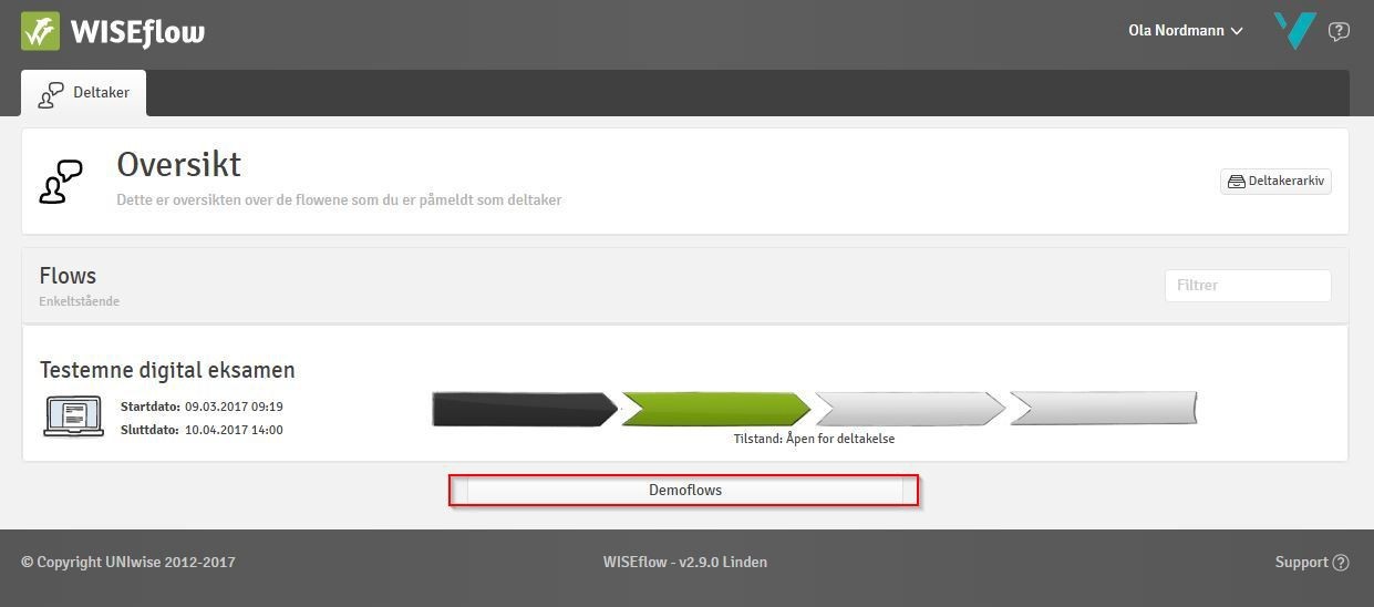 Under "Demoflows" kan du prøve en demo av ulike eksamenstyper i WISEflow. Dette kan du gjere uavhengig av din egen eksamen, og teste om programvaren du har installert fungerer på din maskin.