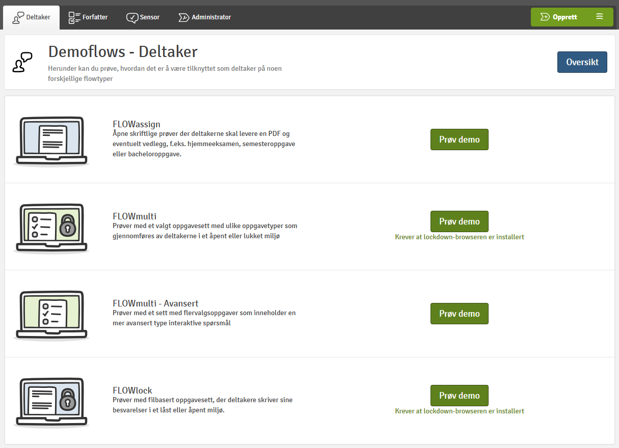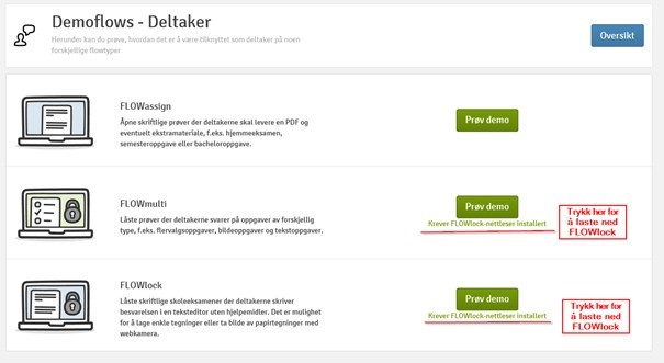 - Kjør en demo av enten FLOWlock (skrive-eksamen med vedleggsverktøy) eller FLOWmulti (meir interaktiv eksamen med MCQ eller liknande).