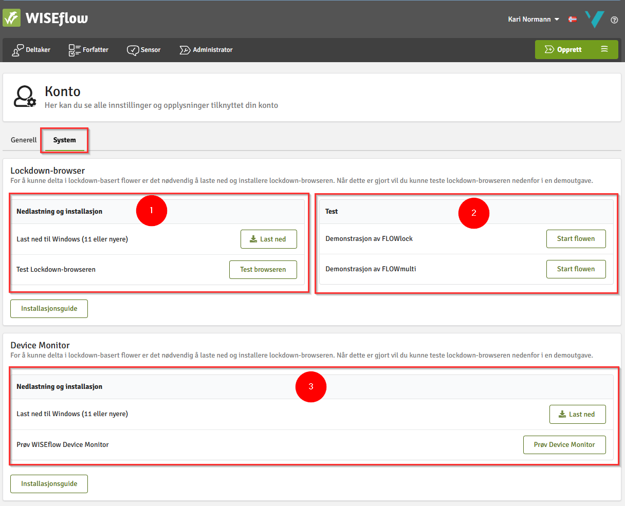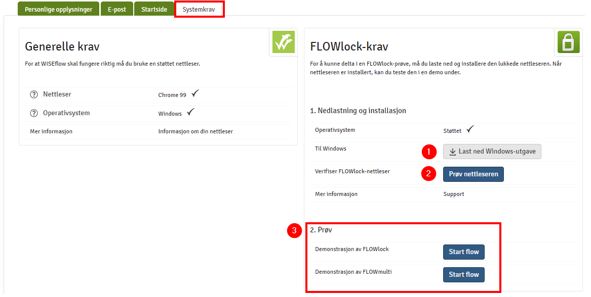 Merk at for å prøve programvaren må dette skje enten på en eksamen eller via "demo" på denne siden eller under "Demoflows" som er beskrive i punktet under. For å kjøre en test, må du også godta programvaren og lukke eventuelle "ulovlige" bakgrunnsprogramvarer som Teams, Outlook, skjermdelingsprogram, etc.
