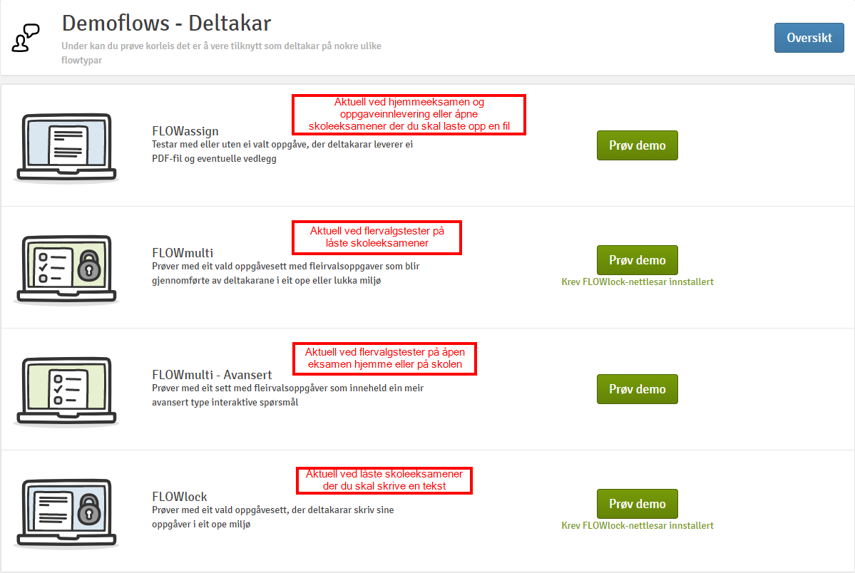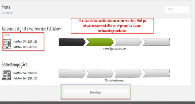 Demoflow – her vil du se alle testeksamener som er tilgjengelig for deg. Her kan du teste hvordan en eksamensinnlevering i WISEflow fungerer. Dette kan du gjøre så mange ganger du ønsker.