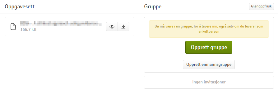 Oppgavesett – i dette området vil du finne eksamensoppgaven og eventuelt mulighet for å opprette eller bli med i en gruppe dersom det er en gruppeeksamen. Oppgavesettet blir tilgjengelige ved eksamensstart.