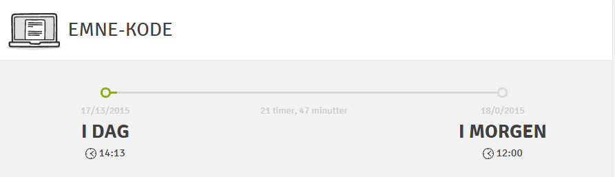 Du klikker på grønn pil i emnet du ønsker å levere eksamen i. Du har tilgang til eksamen før ogetter start- og slutttidspunkt ved å trykke på en av de svarte pilene. Dialogvinduet for eksamensinnlevering er delt i fire områder. Det øverste feltet viser navnet på emnet og periode for eksamen:
