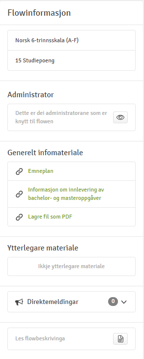 Flowinformasjon – i dette området vil du finne bl.a. studiepoeng for emnet, emnebeskrivelse, hvem som er administrator for emnet, informasjon og eventuelle direktemeldinger.
