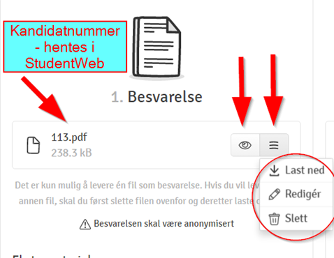 Du kan slette, laste opp eller endre filnavn på besvarelsen innenfor eksamenens tidsfrist. Det kan være lurt å sjekke at du har levert riktig versjon av besvarelsen ved å trykke på se-symbolet.