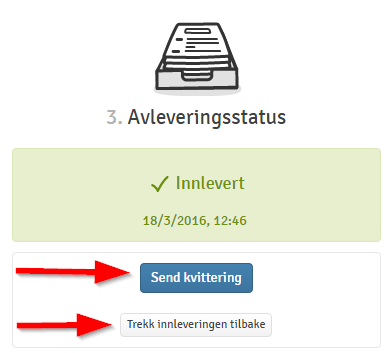 Hvis du ønsker å motta kvittering for levert eksamensbesvarelse klikk på Send kvittering. Kvitteringen vil bli sendt til din student e-post. Merk at du kan trekke besvarelsen tilbake og levere på nytt helt fram til siste frist for innlevering.