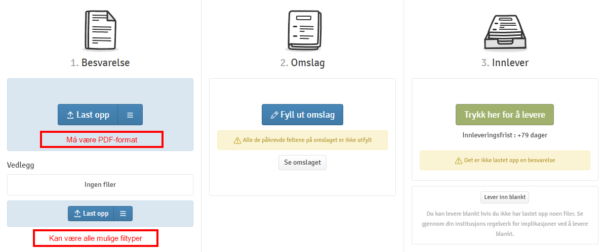 Det er viktig å levere (laste opp) besvarelse innenfor gitt tidsfrist, samt sjekke at filformat og filnavn er i hht. kravene for eksamensinnlevering. Sjekk også at du har lastet opp riktig versjon av eksamensbesvarelsen.