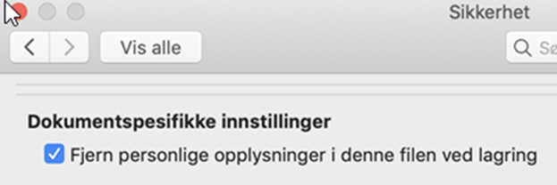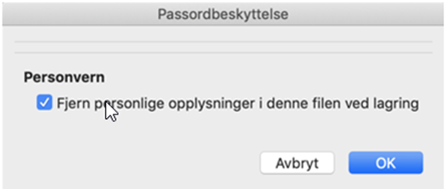 Kryss av alternativet Fjern personlige opplysninger ved lagring og trykk OK for å behalde denne innstillinga i dette dokumentet.