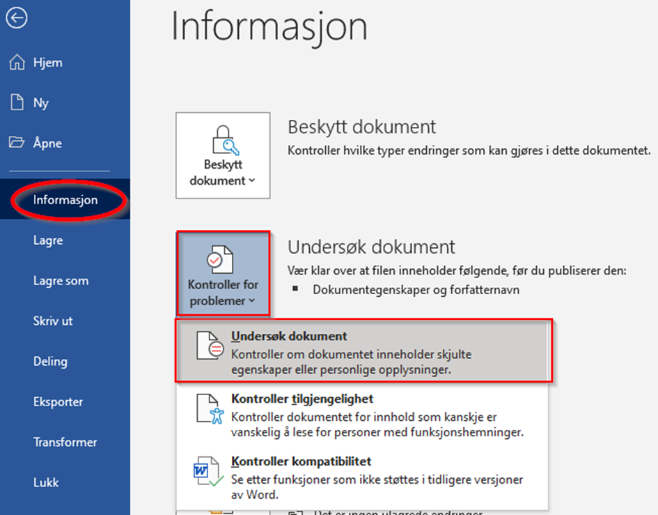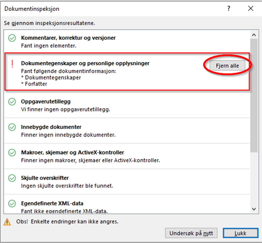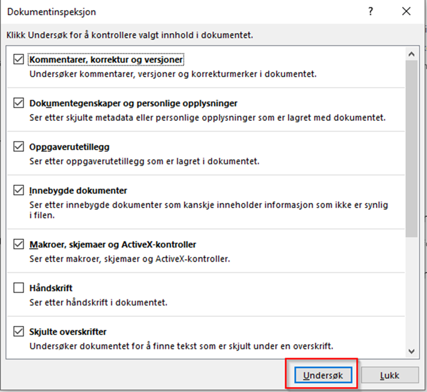 Vindauget Dokumentinspeksjon dukkar opp. Trykk på Undersøk nedst i ruta.
