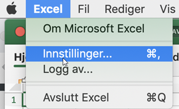 Trykk på Excel frå menylinja øvst i dokumentet og velg Innstillinger.