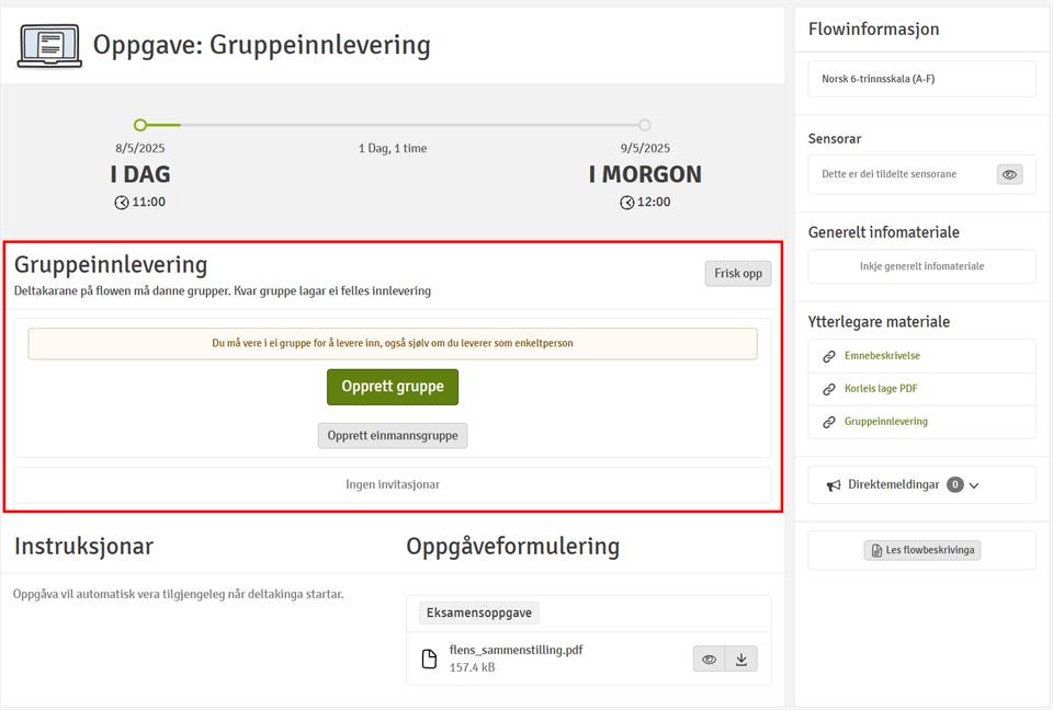 Ved en gruppeoppgave vil du få opp teksten: «Du må være i en gruppe, for å levere inn, også selv om du leverer som enkeltperson». Her har du valget mellom å trykke «Opprett gruppe» eller «Opprett enmannsgruppe».
