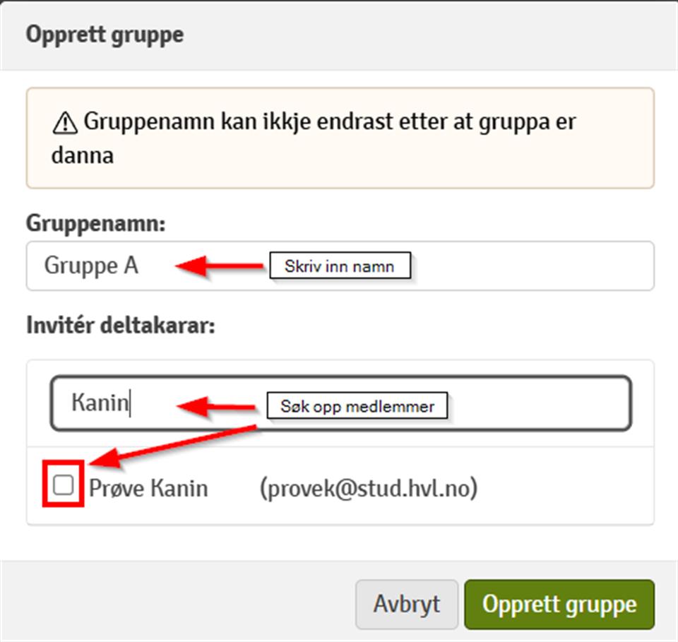 2. Lag navn på gruppen. Dersom eksamen er anonym, vil navnet ikke være synlig for sensor. Dersom dere skriver inn feil navn, må dere fjerne deltakere, slette gruppen og opprette den på nytt.
