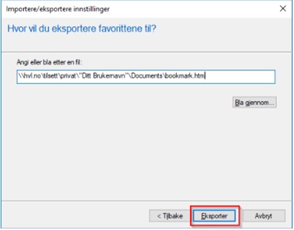 Legg merke til filplasseringen og klikk på Eksporter. (Ev. klikk «Bla gjennom» og velg en annen filplassering.) Filen kan etterpå importeres til en annen nettleser.