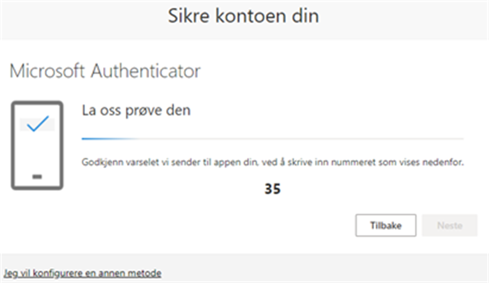 Dersom du ikkje har eller vil bruke Microsoft Authenticator, kan du trykke på "Eg vil bruke ein annan godkjenningsapp". Prosessen vidare er lik som med Authenticator.