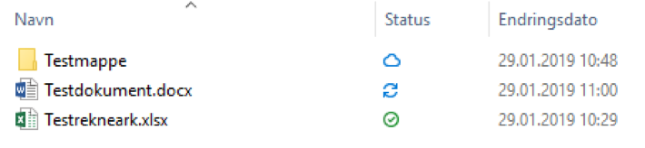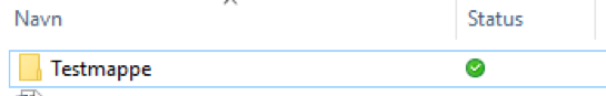 Legg merke til Statuskolonna. Det øvste symbolet tyder at Testmappa ligg i skylageret, den er ikkje kopiert ned til lokal disk.