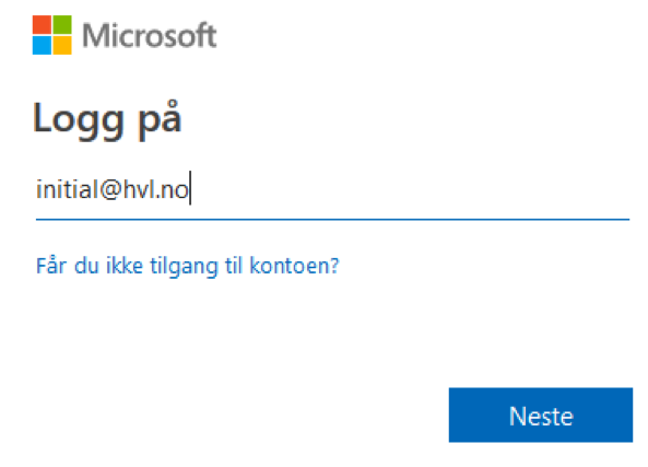 Då opnast ein nettleser, og viss du ikkje er logga på Office 365 frå før må du logge på no. Skriv inn brukarnamnet ditt med @hvl.no og klikk Neste: