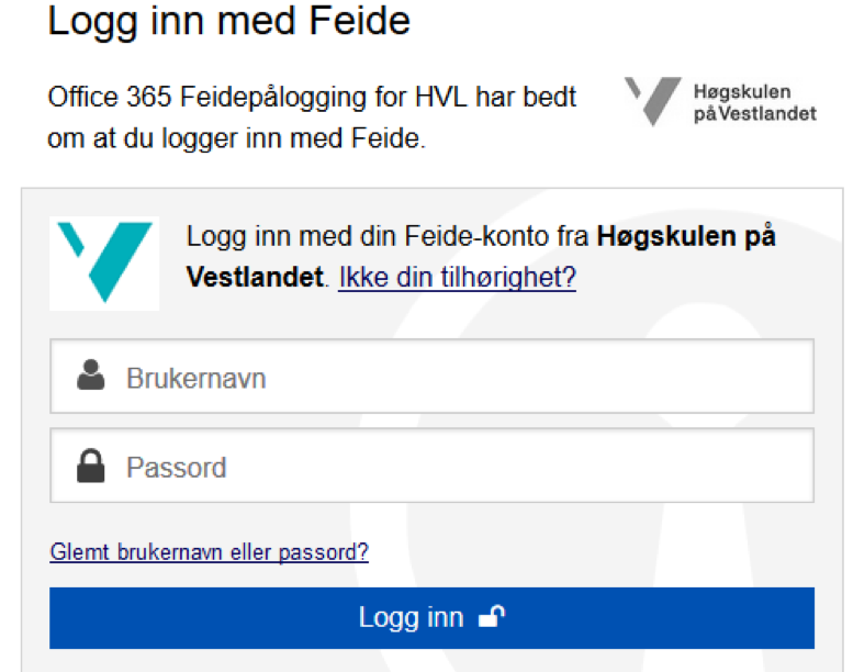 Då vert du sent vidare til Feidepålogging. Der skriv du brukarnamnet utan @hvl.no og passord, og klikkar Logg inn: