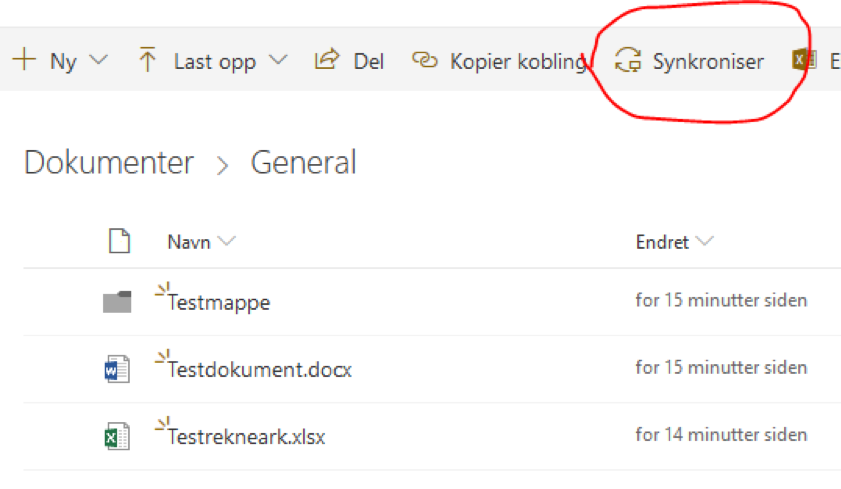 Det midterste symbolet tyder at Testdokumentet vert synkronisert no, det vil vera slik om du opnar det på din eigen maskin, eller om du nett har kopiert det inn og det ikkje har rukke å bli synkronisert opp i sky enno.