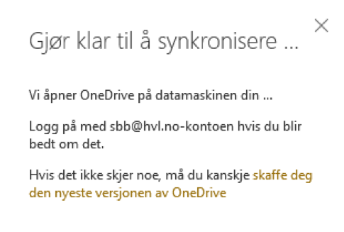 Det har hendt at nokon må klikke på lenka og skaffe seg den nyaste versjonen av OneDrive, men på HVL sine maskiner skal dette normalt vere på plass.