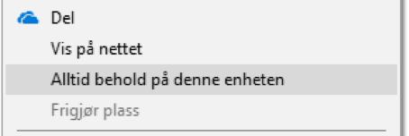 Då vil Windows ikkje slette den lokale kopien, og du sikrar at du har ein kopi lokalt og ikkje er avhengig av at nettet er raskt nok til å jobba. Treng du ikkje lokal kopi lenger kan du velge Frigjør plass frå den same menyen.