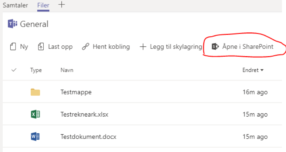 Under kvar kanal er det ei fane som heiter Filer. Det du legg der er tilgjengeleg for alle som er medlem i teamet. For å gjere dette fillageret lett tilgjengeleg i Windows kan du velge å synkronisere det. Du velger sjølv kva du vil ha synkronisert, det må gjerast for kva enkelt kanal du vil ha inn. Klikk på Filer og på Åpne i SharePoint: