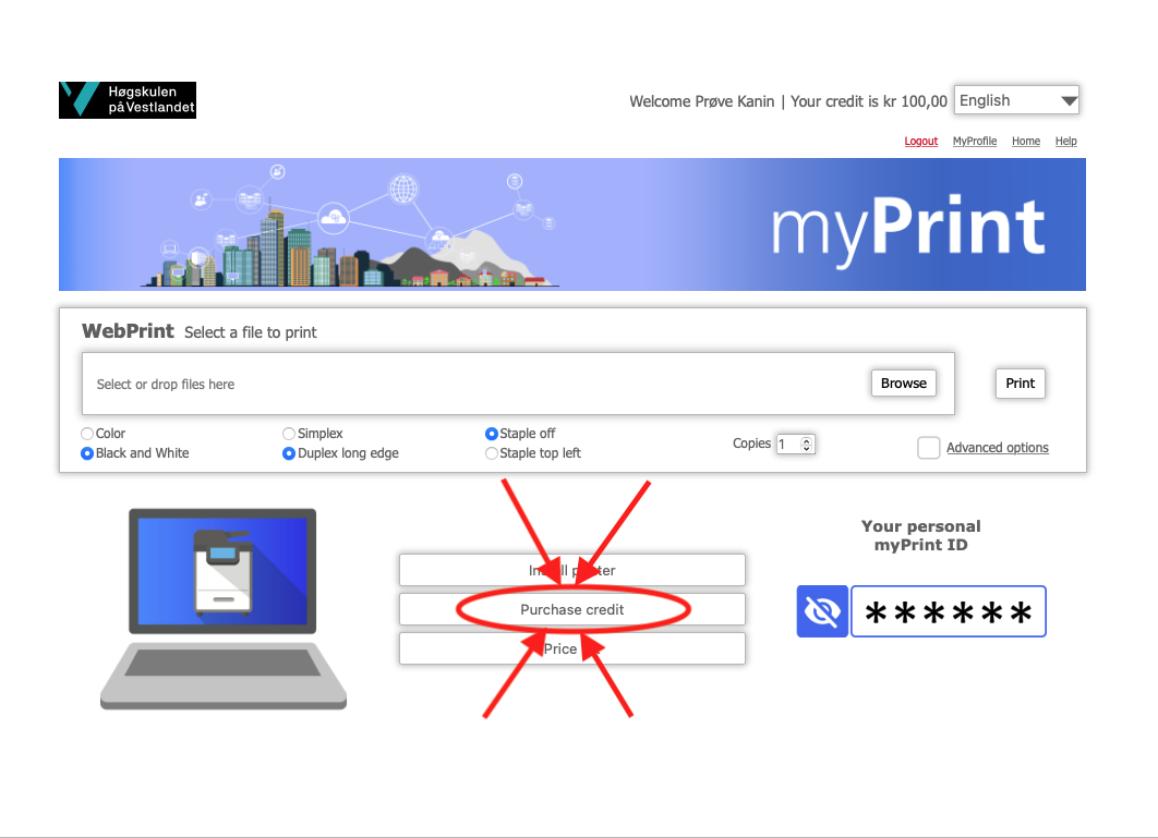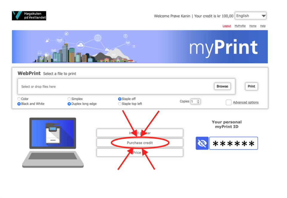 Gå til Myprint.hvl.no og logg inn med brukarnamn og passord. Eit påloggingsbilete vil opnast. Klikk på knappen "Purchase credit" for å fylle på kreditt.