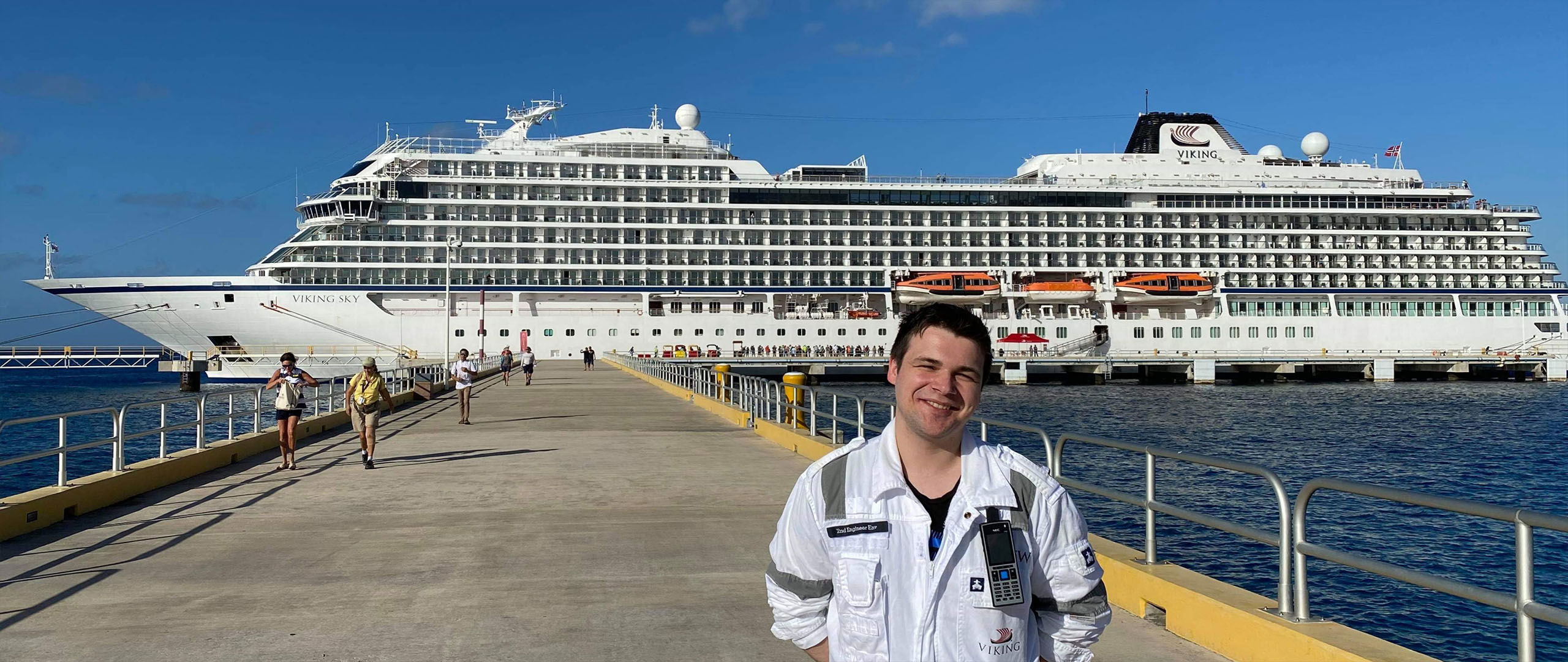Erik Simonsen (26) jobbar til dagleg som førstemaskinist for Viking Ocean Cruises, samtidig med at han tar ein bachelor i Maritime Management.
