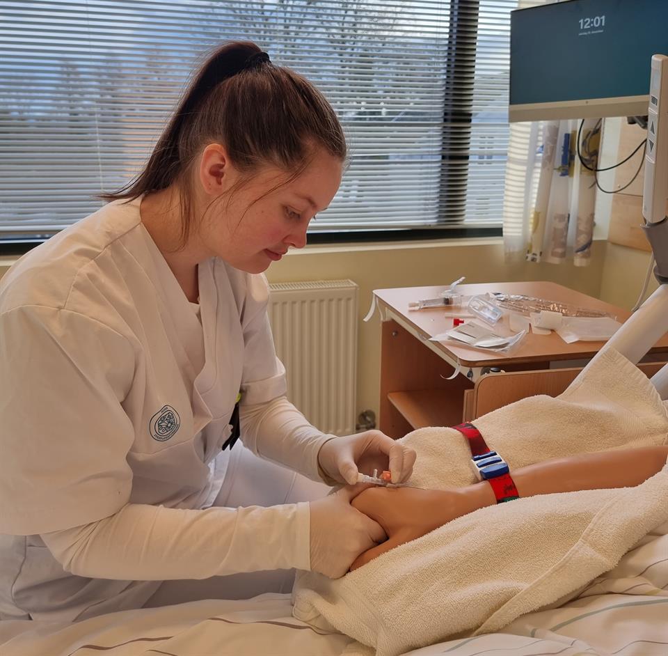 Nora legg ikkje skjul på at sjukepleiestudiet kan vere krevjande, men at ein kan komme langt med motivasjon og logisk tenking. På studiet lærer ho alt det grunnleggande innanfor veldig mange ulike tema. Dei lærer mellom anna å sette PVK (perifere venekateter) og har ein simuleringsarena der dei kan gjere praktiske oppgåver. Arenaen er som eit sjukehus, og pasientane er dokker som kan snakke.