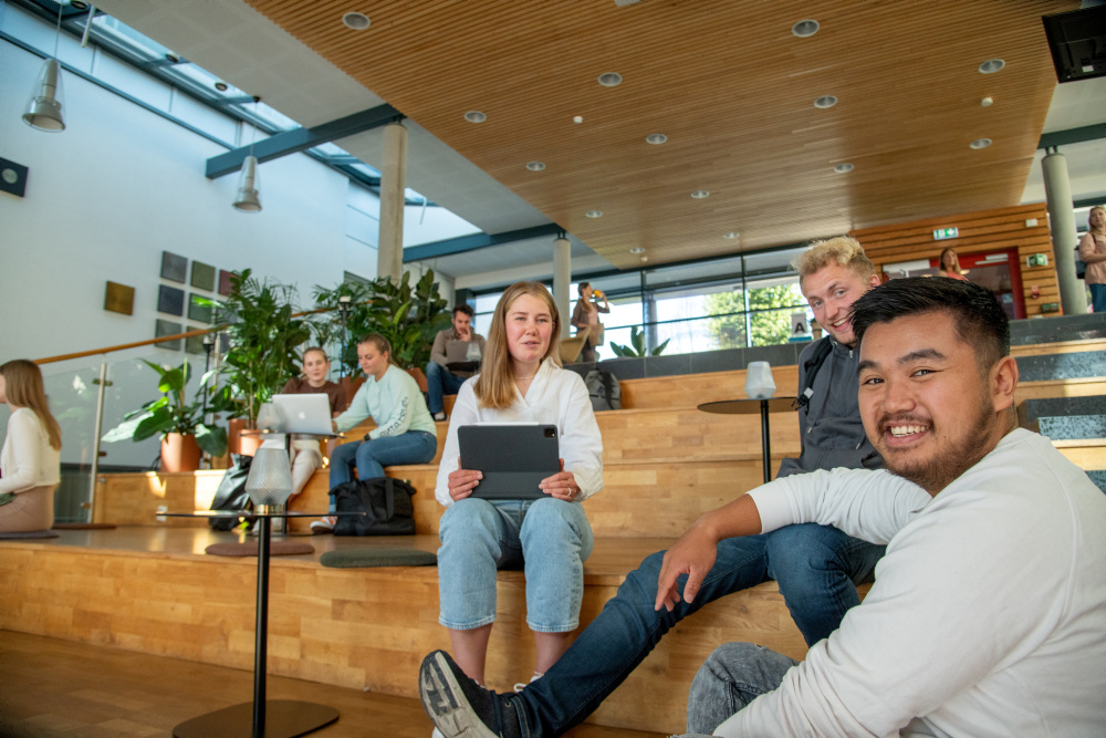 Studentkafeen, Global Lounge og vrimleområdene har gode sittegrupper og er også populære arbeidsplassar for studentane våre.